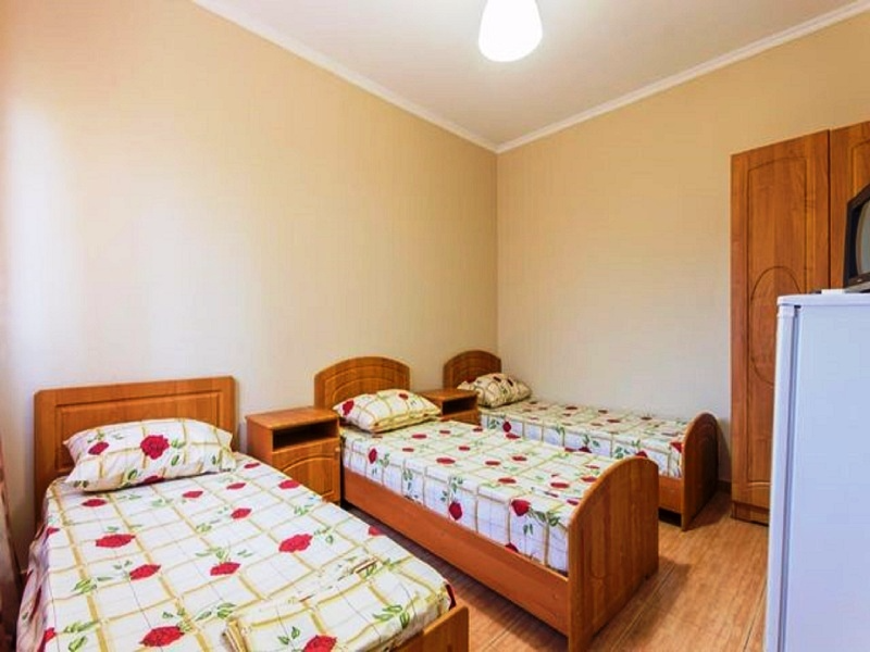Размещение: 2-х местный номер с удобствами и балконом (3 этаж): двуспальная или две односпальные кровати, прикроватная тумбочка, шкаф для одежды, санузел, зеркало, сплит-система, телевизор, холодильник, балкон. 2-х местный номер с удобствами без балкона (1, 2 этаж): двуспальная или две односпальные кровати, прикроватная тумбочка, шкаф для одежды, санузел, зеркало, сплит-система, телевизор, холодильник. 3-х местный номер с удобствоми без балкона (1, 2 этаж): три односпальные кровати, платяной шкаф, туалетный стол, стул, санузел, зеркало, сплит-система, телевизор, холодильник. Возможна установка доп. места. 3-х местный номер с удобствами и балконом (3 этаж): три односпальные кровати, платяной шкаф, туалетный стол, стул, санузел, зеркало, сплит-система, телевизор, холодильник, балкон. Возможна установка доп. места. 4-х местный номер с удобствами без балкона (1 этаж): односпальные кровати, шкаф, прикроватные тумбочки, зеркало, сплит-система, телевизор, холодильник, санузел. 2-х комнатный 4-х местный номер с удобствами и кухней (2 этаж), возможно размещение до 5 чел.: в первой комнате - спальная, во второй - спальное место и кухня, две двуспальные кровати или двуспальная кровать + ракладной диван, прикроватные тумбочки, платяной шкаф, кухонный гарнитур, обеденный стол, стулья, санузел, сплит-система, телевизор, холодильник, балкон. Возможно доп. место - ракладное кресло (кресло-кровать) 2-х комнатный 6-х местный номер с удобствами без кухни (3 этаж): две изолированные комнаты, в которых две двуспальные кровати, односпальная кровать, прикроватные тумбочки, два туалетных столика, стулья, два санузла в номере, кухонный гарнитур, обеденный стол, стулья, санузел, сплит-система, телевизор, холодильник, балкон. Возможна установка доп. места. |
