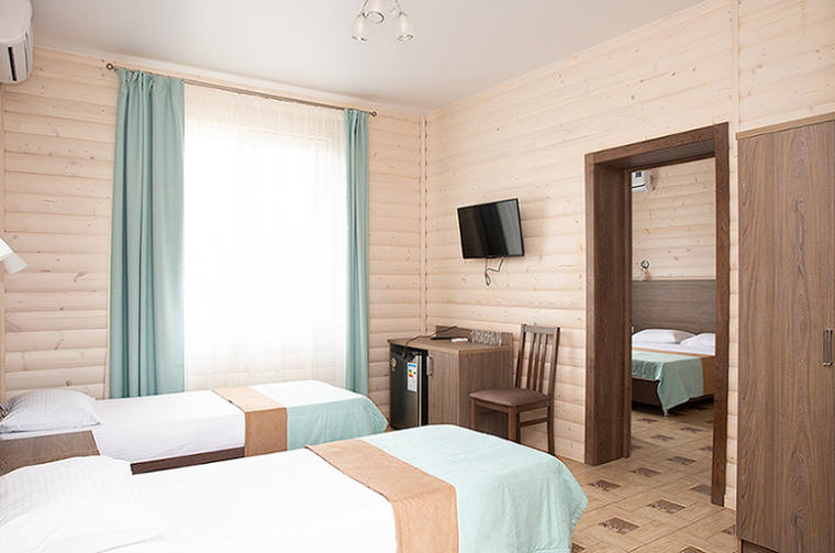 Телевизор (20 каналов), Сплит-система или кондиционер, Холодильник, Кухня (общая, на 5 комнат), Санузел с душем (один на две комнаты 1го этажа), Большая веранда со столом и стульями, Парковка рядом с коттеджем, 60 метров до моря Корпус "Комфорт" трехместный номер:Однокомнатный номер для троих с одной большой семейной кроватью и одной дополнительной кроватью.