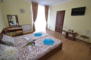 2-х местный без балкона/ с балконом: Уютный однокомнатный номер с одной двуспальной или двумя односпальными кроватями. В номере: 2 односпальные кровати / 1 двуспальная кровать, мини-холодильник, электрочайник, кондиционер, телевизор, туалетная комната: душевая кабина, набор полотенец. Дополнительное место - не предусмотрено. 3-х местный с открытой верандой: Особенностью данного номера является индивидуальная, уютная веранда увитая виноградником, которая существенно увеличивает его площадь. На веранде номера расположена оборудованная мини-кухня с необходимой мебелью. В номере: диван-кровать (1,40 метра), двуспальная или односпальные кровати, мини-кухня (кухня на веранде, без газовой или электро плиты), мини-холодильник, электрочайник, телевизор, индивидуальный сейф, туалетная комната: душевая кабина, набор полотенец. Возможно дополнительное место. 3-комнатный с открытой верандой: Трехкомнатный номер с открытой верандой идеально подходит для проживания семье с детьми или дружной компании. Номер рассчитан на проживание пяти человек, возможно размещение дополнительного места. На веранде номера расположена оборудованная мини-кухня с необходимой мебелью. В номере: две двуспальные кровати, односпальная кровать, угловой диван, мини-кухня (кухня на веранде, без газовой или электро плиты), мини-холодильник, электрочайник, телевизор, индивидуальный сейф, туалетная комната: душевая кабина, набор полотенец. 3-комнатный с закрытой верандой: Трехкомнатный номер с закрытой верандой - сочетание максимального комфорта и функциональности. Номер рассчитан на проживание пяти человек, возможно размещение дополнительного места. Особенностью данного номера является индивидуальная, уютная веранда, которая существенно увеличивает его площадь. На веранде номера расположена оборудованная мини-кухня с необходимой мебелью. В номере: двуспальная кровать, двуспальный диван, односпальная кровать, двухъярусная кровать, мини-кухня (кухня на веранде, без газовой или электро плиты), мини-холодильник, электрочайник, кондиционер, телевизор, индивидуальный сейф, туалетная комната: душевая кабина, набор полотенец. 2-комнатный люкс с балконом: Просторный двухкомнатный люкс номер с балконом идеально подходит для проживания семье с детьми или дружной компании. В номере две изолированные, просторные и светлые комнаты. В каждой комнате свой кондиционер. Также в номере есть полностью оборудованная кухня с газовой плитой и всей необходимой посуды. В номере: двуспальная кровать, двуспальный диван, односпальная кровать, полуторный диван, полностью оборудованная кухня с газовой плитой, холодильник, электрочайник, кондиционер, телевизор, туалетная комната: душевая кабина, набор полотенец. 2-комнатный с верандой: Двухкомнатный номер с открытой верандой рассчитан на проживание четырех человек. Номер состоит из гостиной и изолированной спальни. В номере индивидуальная веранда, на которой расположена оборудованная мини-кухня с необходимой мебелью. В номере: двуспальная кровать, двуспальный диван, мини-кухня (кухня на веранде, без газовой или электро плиты), мини-холодильник, электрочайник, телевизор, индивидуальный сейф, туалетная комната: душевая кабина, набор полотенец. Дополнительное место - не предусмотрено. 2-комнатный с балконом: Просторный двухкомнатный номер с
